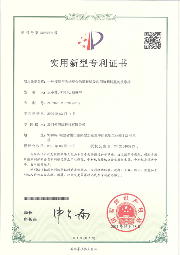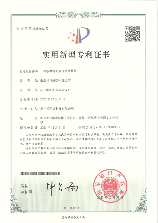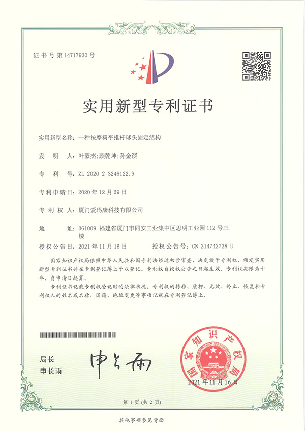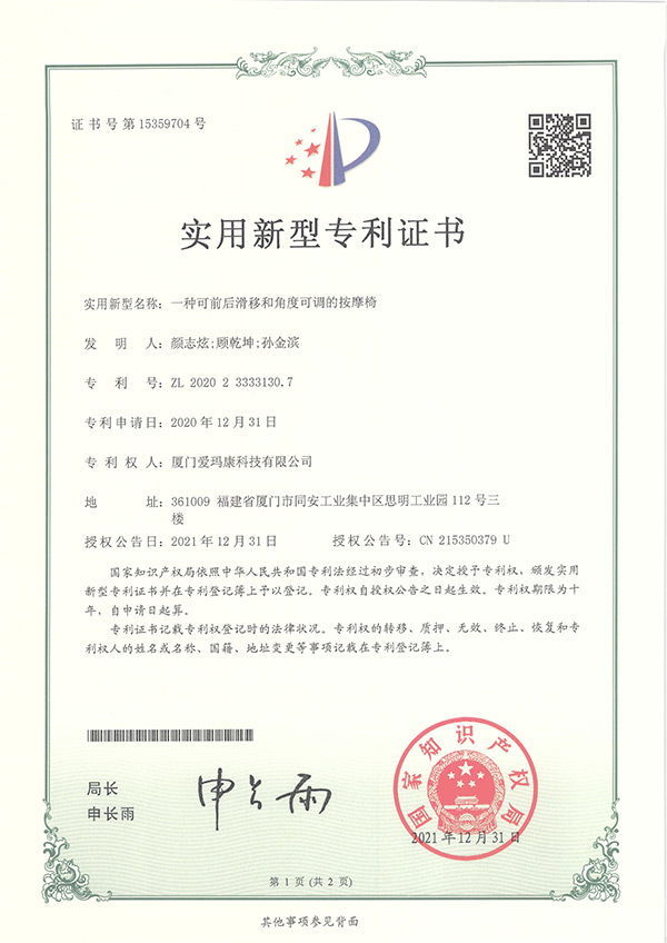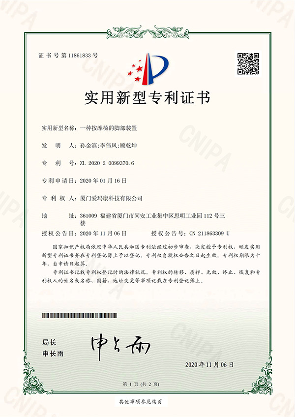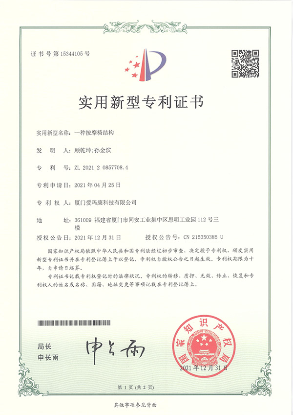 我们的研发团队拥有多项实用新型及外观设计专利,为我们独创的按摩技术保驾护航。
