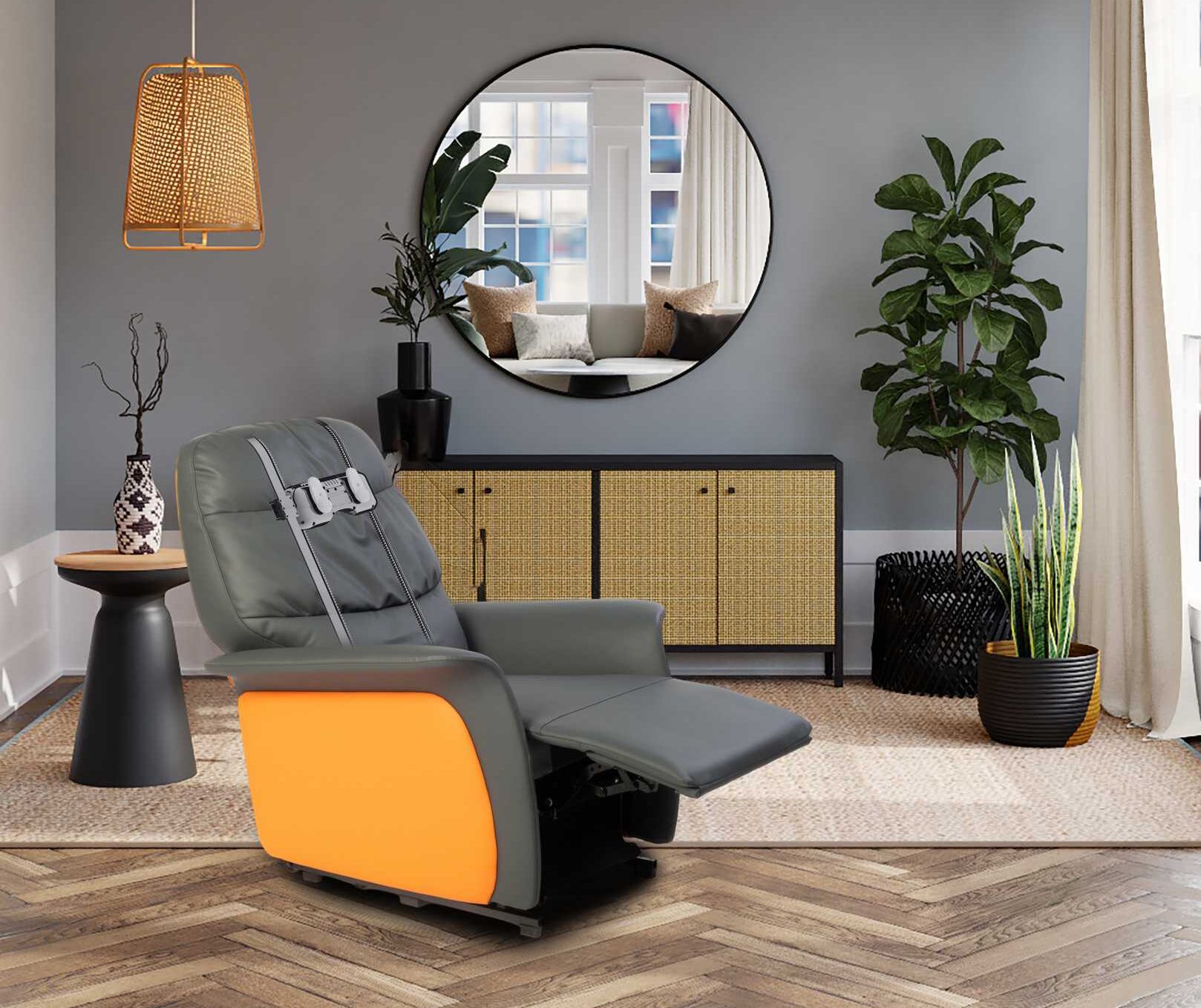 ・双滚轮可动式2D按摩机芯(揉捏、指压) ・隐藏式收纳结构 ・智能遥控器 ・自动抬腿与靠背倾斜功能 ・三档自动摆动功能